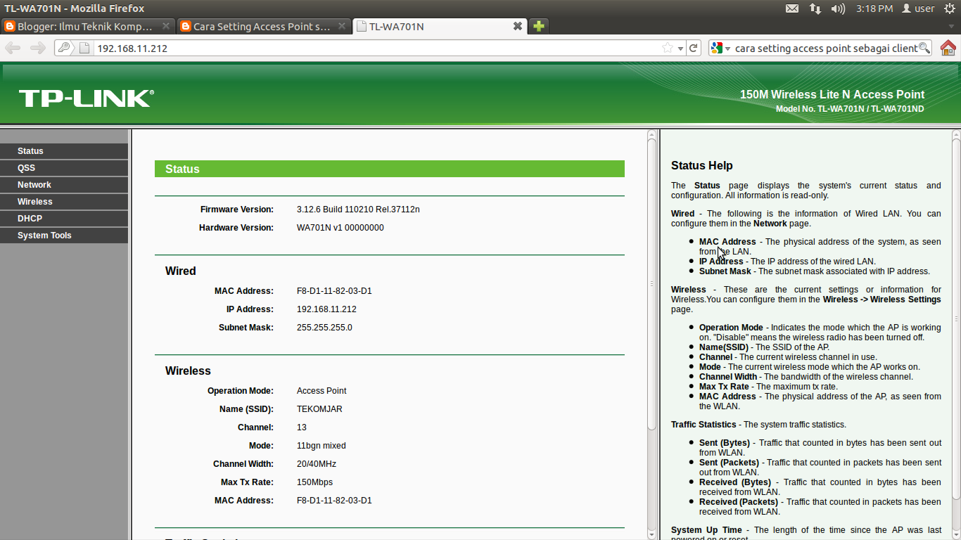 Nah, oleh karena itu pada posting kali ini akan dijelaskan bagaimana setting AP sebagai Penerima atau Client. Disini saya menggunakan AP TP-LINK Model No. TL-WA701N / TL-WA701ND, dan Berikut ini adalah langkah-langkahnya :